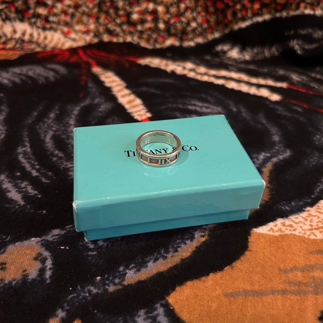 Tiffanyの中でも長く愛されるアトラスシリーズで、ローマ数字を型抜きしてリング全体にデザインされているのが特徴です。材質はSV925で錆びにくい素材で長い年数お使いいただけます。