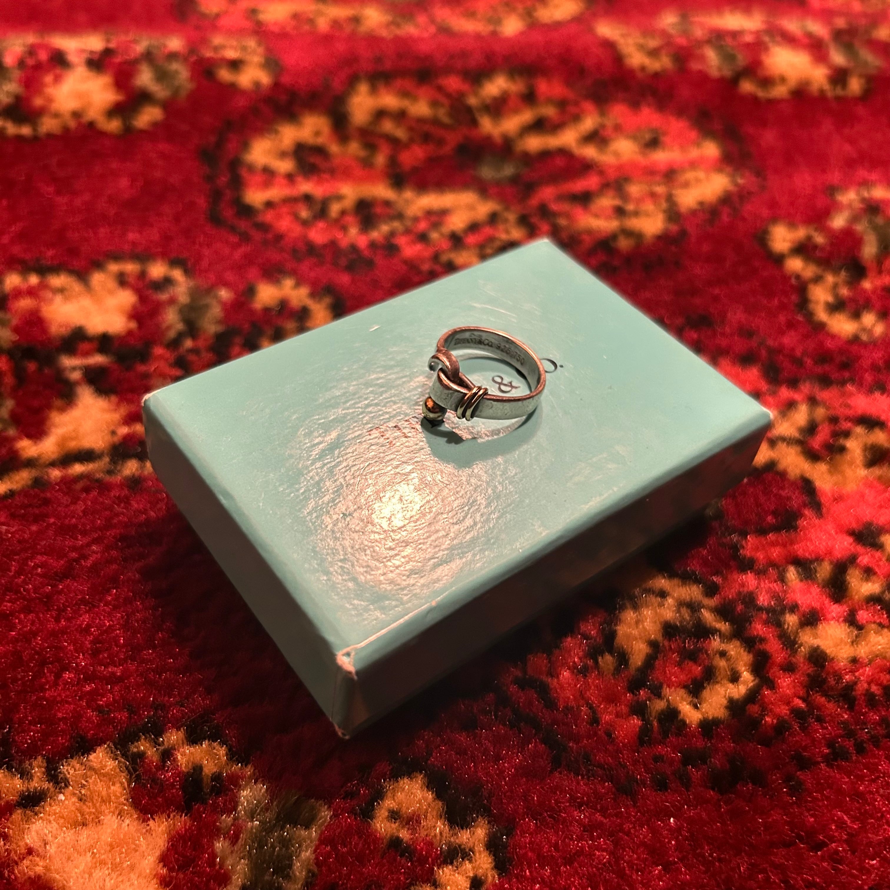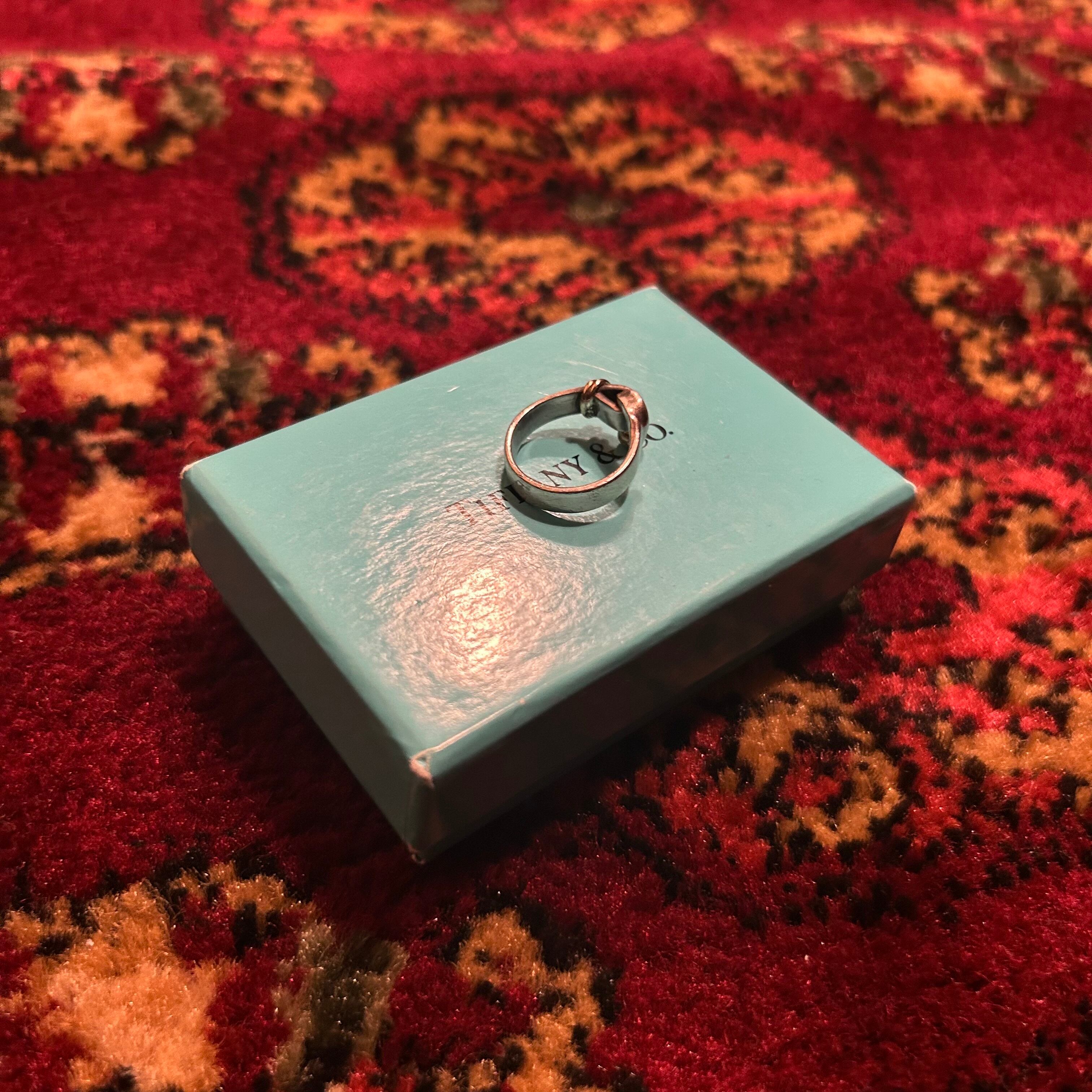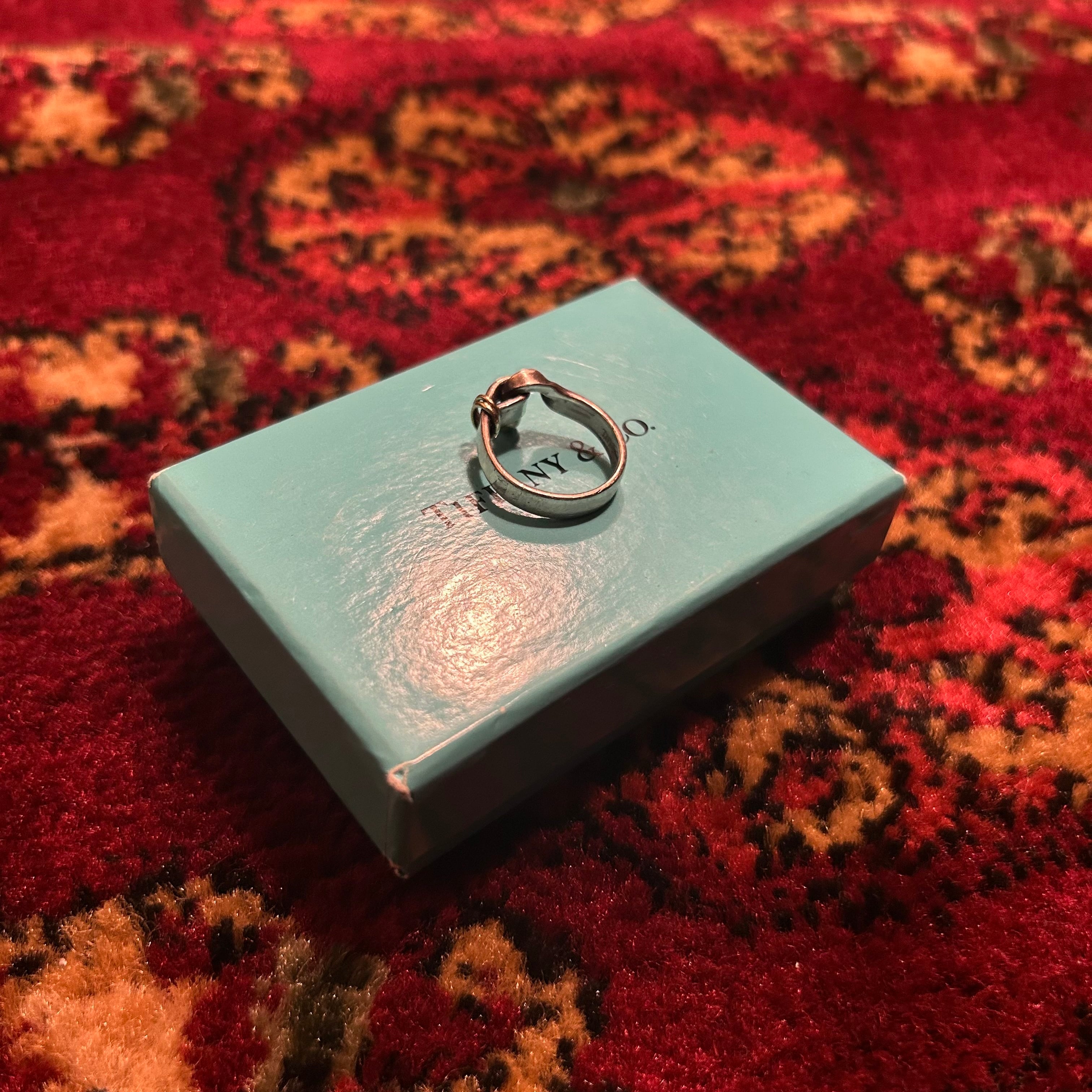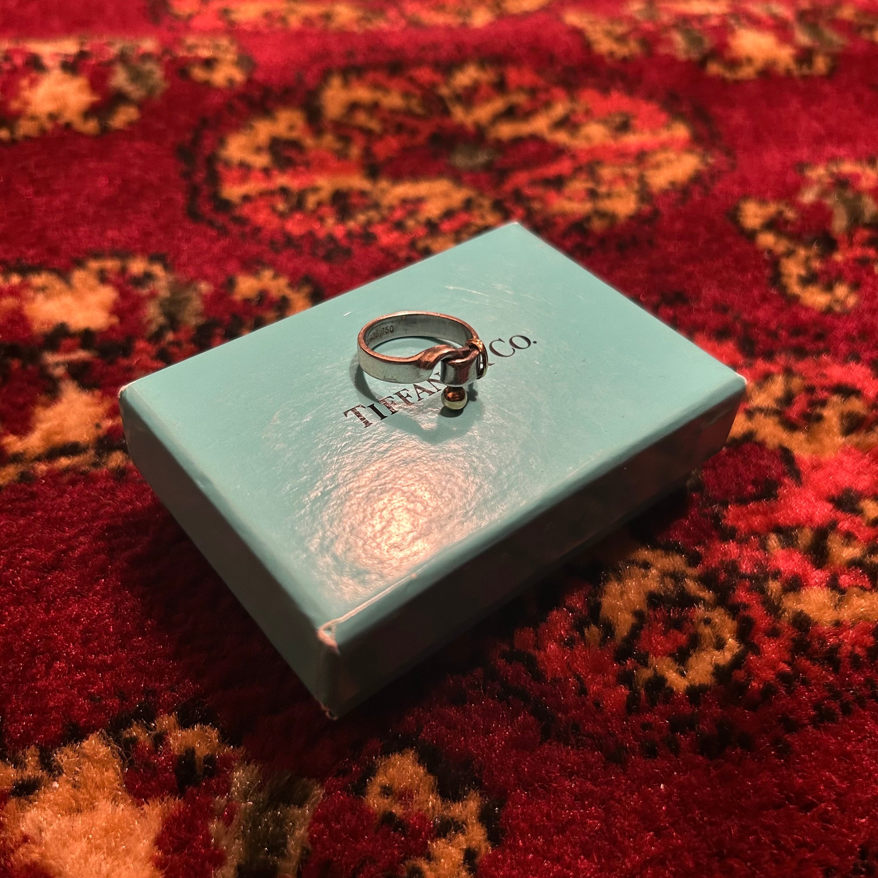 OLD Tiffanyのシルバーリング。 “愛を繋ぐ”フックと“結ぶ愛”を意味するノット、重なり合う2つの輪が“永遠の絆”を意味する「HOOK&EYE(フック&アイ)」シリーズです。材質はスターリングシルバーで錆びにくい素材となっております。こちらは箱無しでのお渡しです。