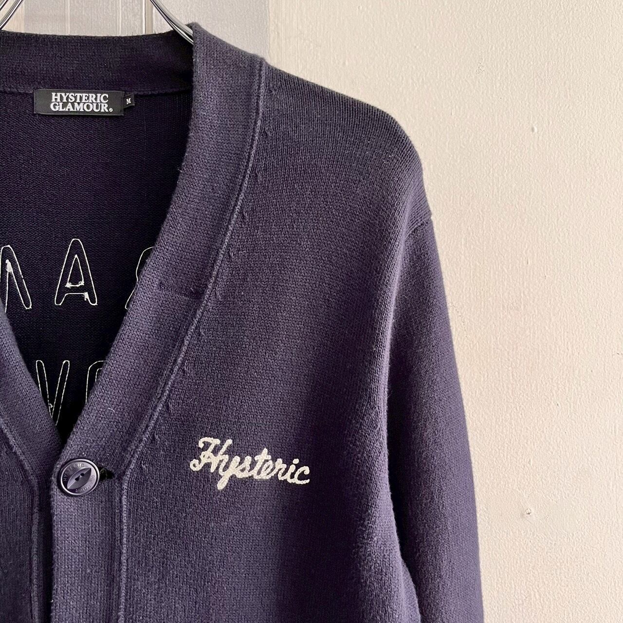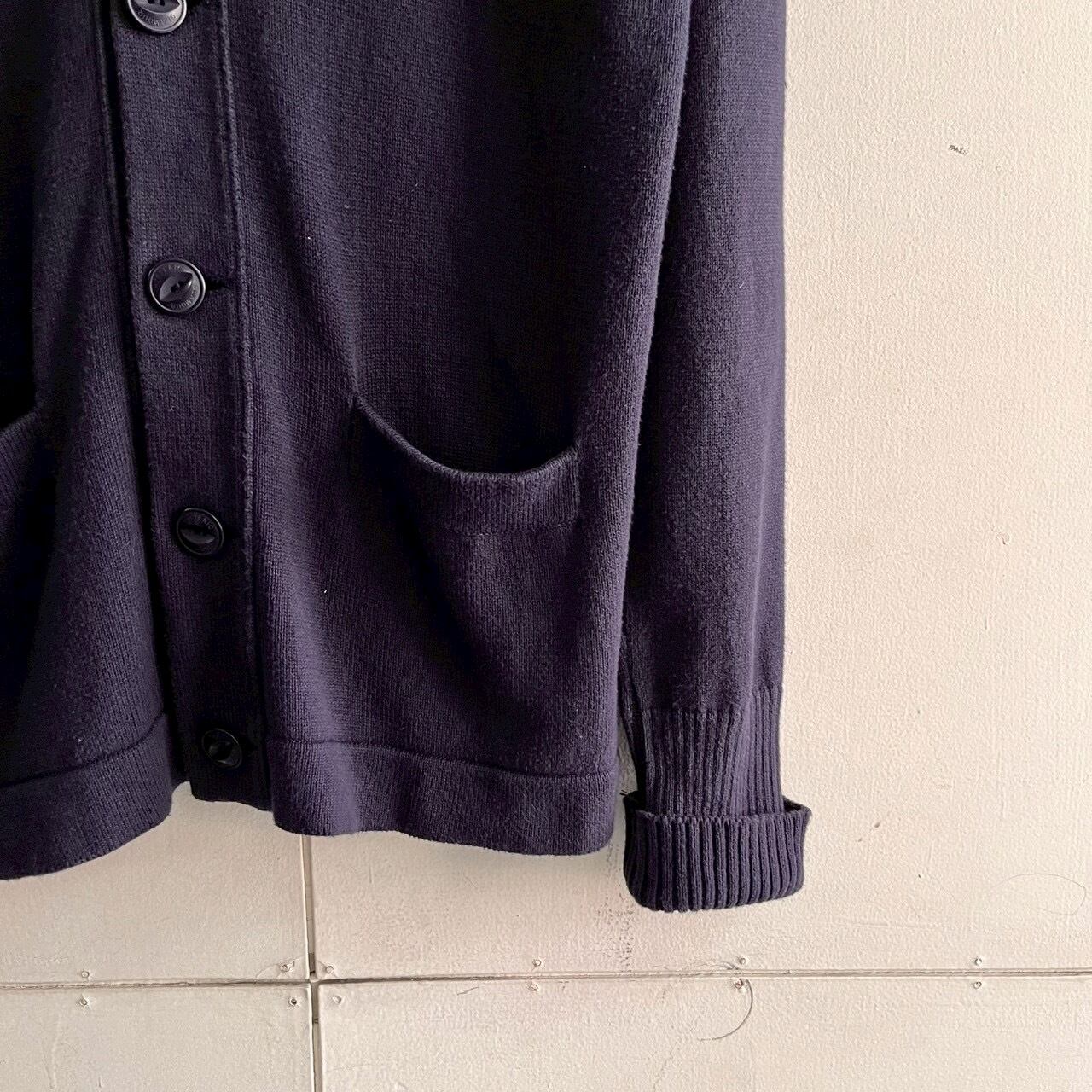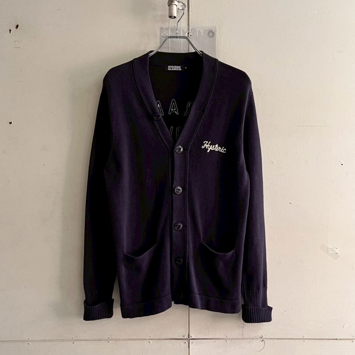 ネイビーカーディガン。胸元にロゴ刺繍、ポケット付き、リブ袖で着心地良く、カジュアルからきれいめまで幅広く活躍する一着。