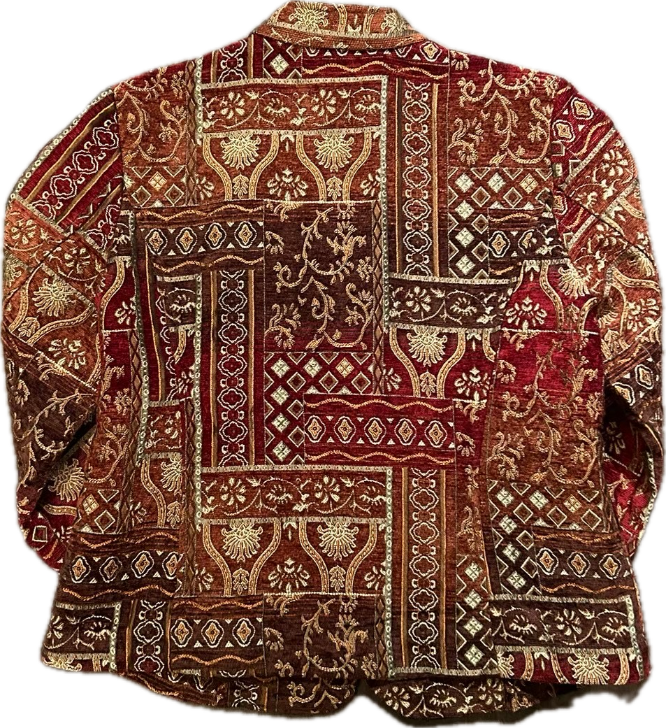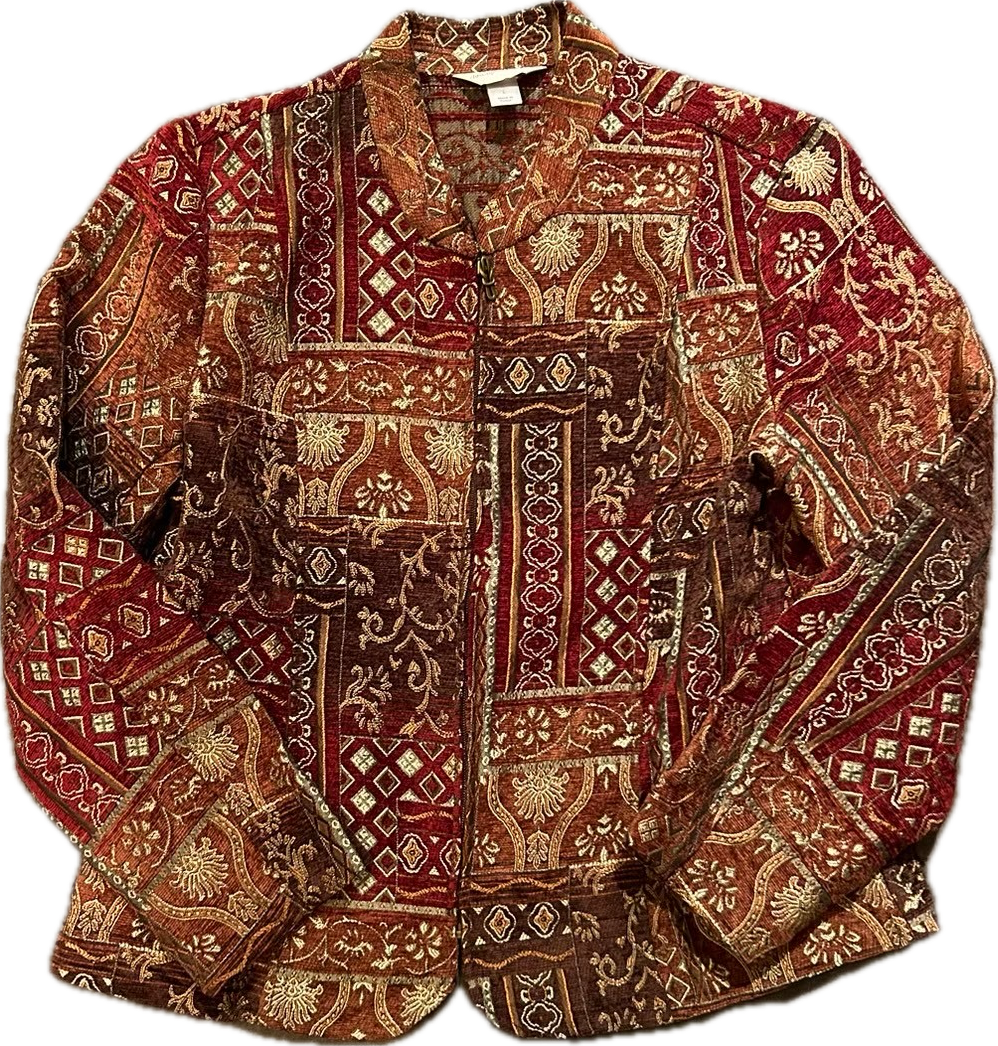 暖色系グラデーションのゴブランジャケットです。ジッパースタイルのジャケットで、さらっと軽めに羽織っていただけます。裏地がないため、重ね着にもおすすめです。