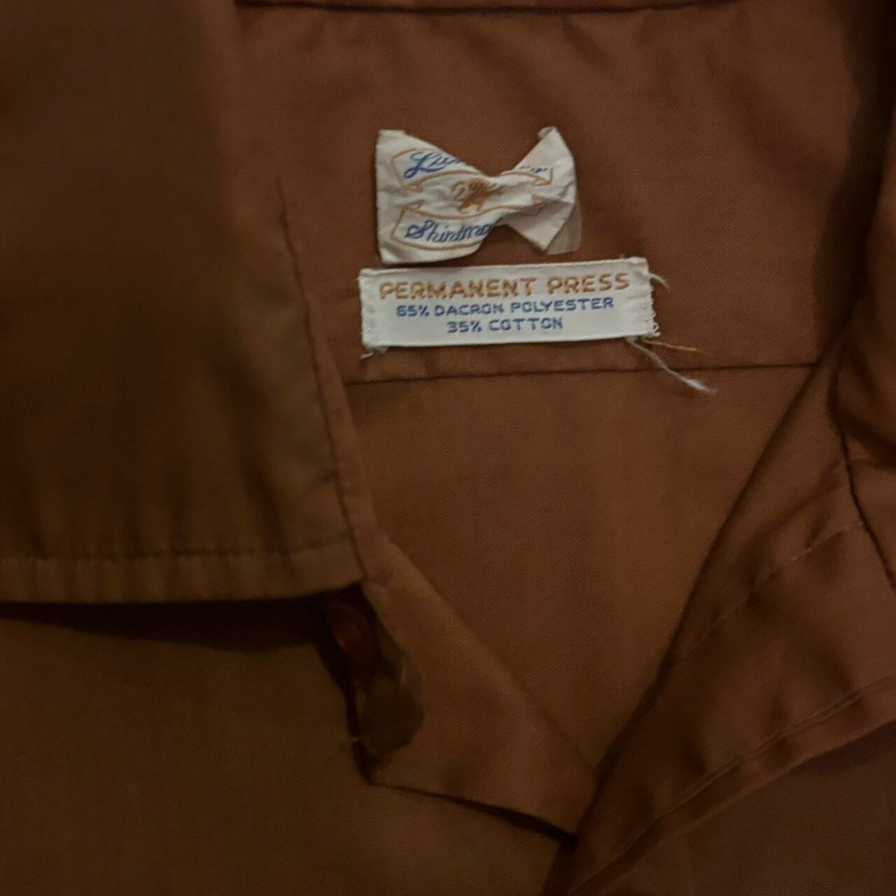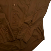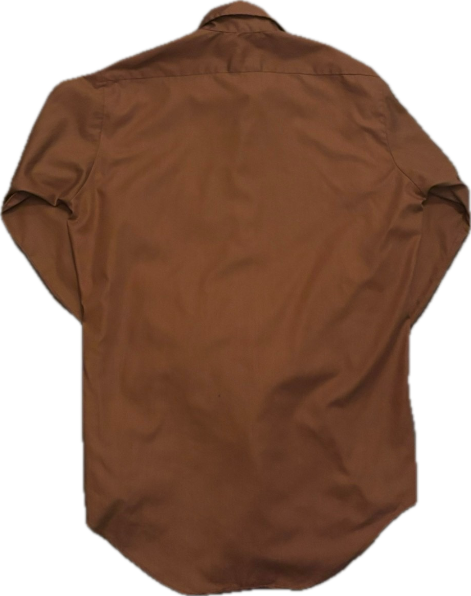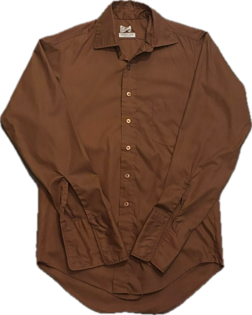 かなり渋いブラウンカラーの70sシャツです。ダブルカフスデザインなので、カフスボタンで遊んでも良し。カラメルのようなボタンも可愛いです。