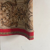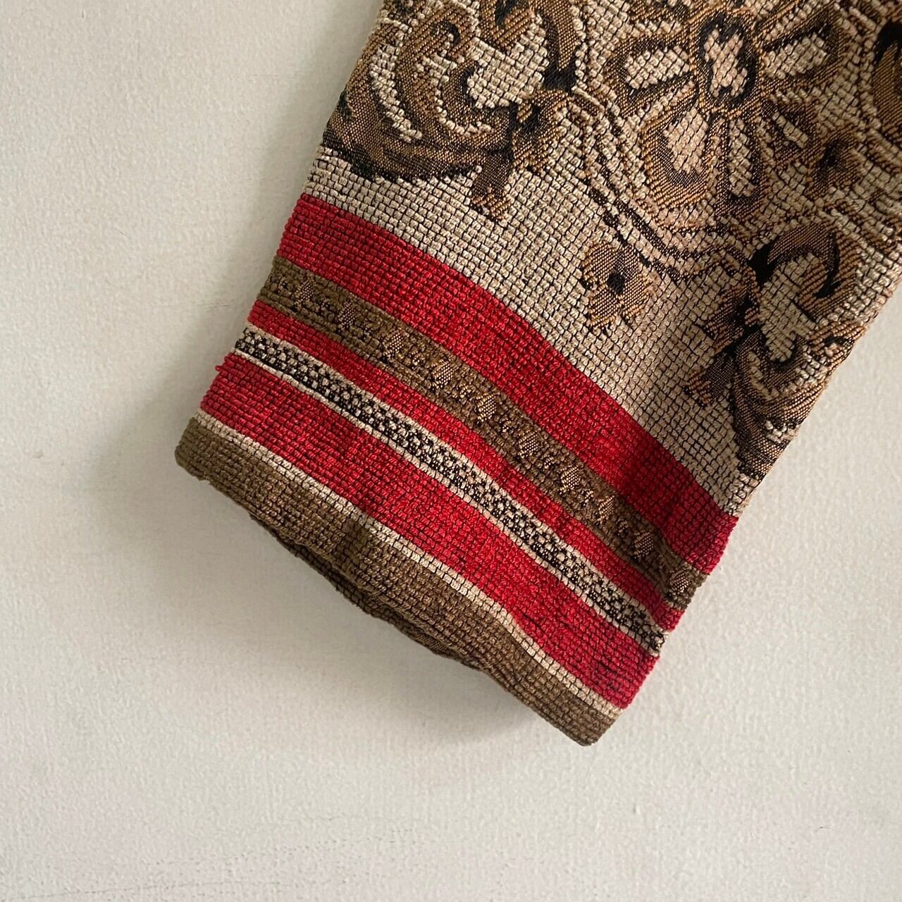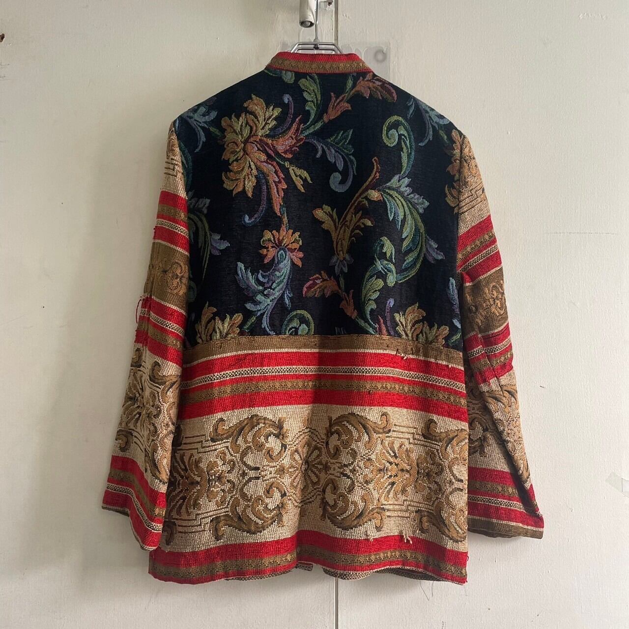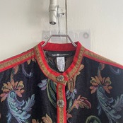 ゴージャスな柄のゴブランジャケット。ノーカラーで身幅すっきり、着丈長めタイプです。変わったボタンがポイントで、ポケット有の優秀ジャケット。